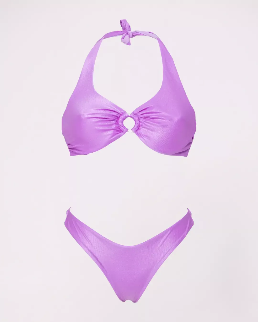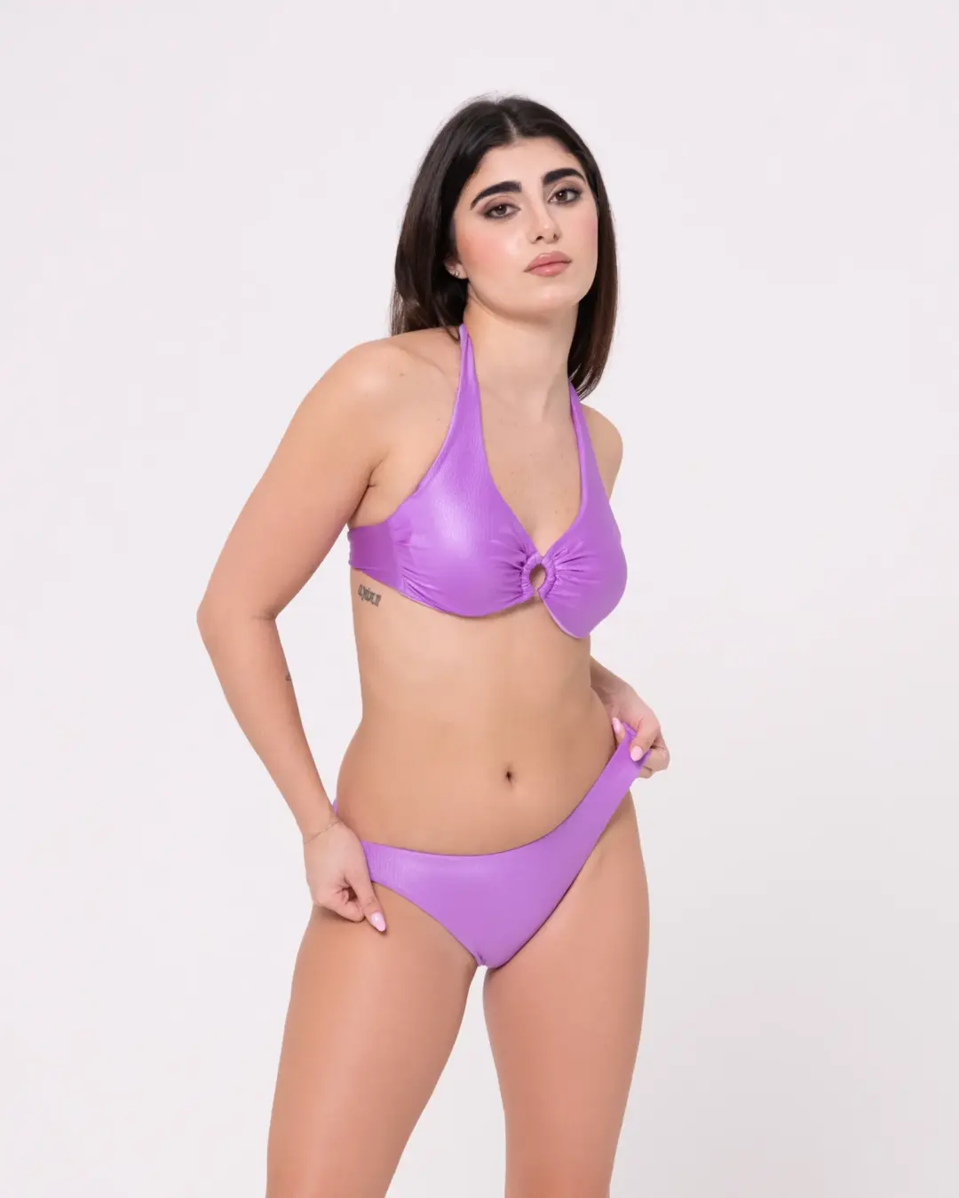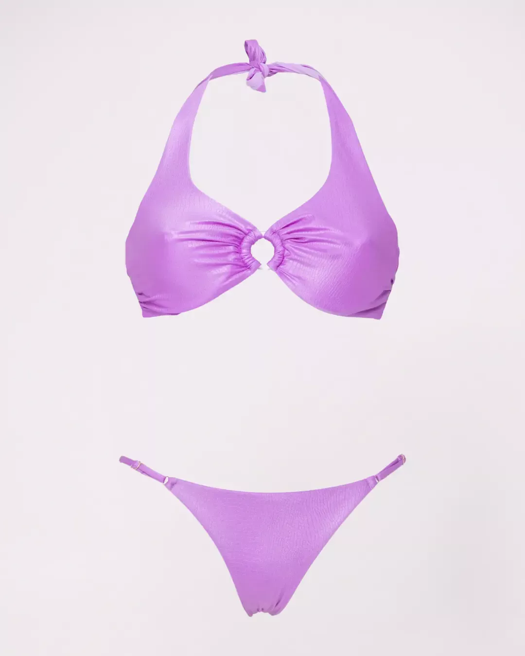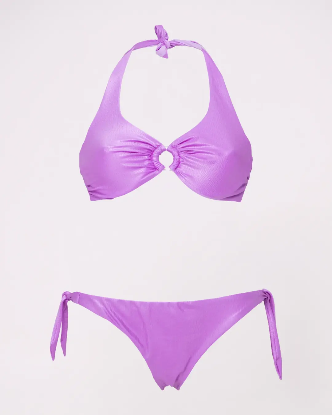 MoD. Vela donna dal design elegante e strutturato, modello a vela ideale per chi cerca sostegno e comfort senza rinunciare allo stile. Realizzato in tessuto di qualità con raffinato effetto coccodrillo, è dotato di ferretti che sostengono e valorizzano il seno. Il dettaglio con anello centrale dona un tocco moderno e femminile, mentre l’allacciatura al collo con fiocco permette una regolazione personalizzata.. Slip brasiliana chiusa, pensato per valorizzare la silhouette a forma di V e slanciare la figura Consigli per vestibilità Abbondante, regolare scegliere la propria taglia. adatto ad un seno prosperoso vestibilità Bottom: regolare- slim, scegliere la propria taglia