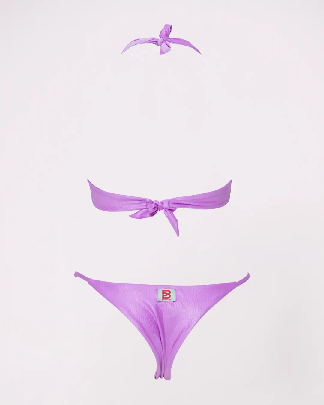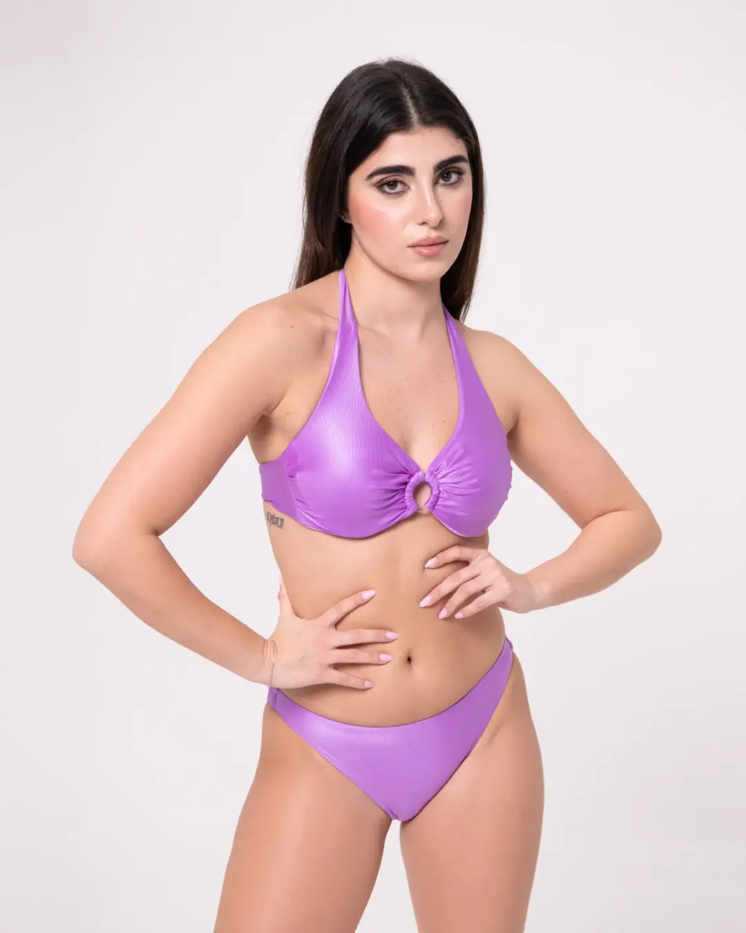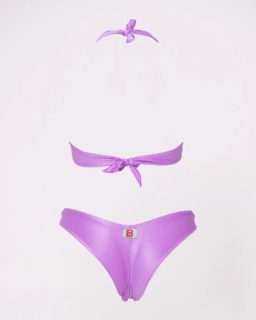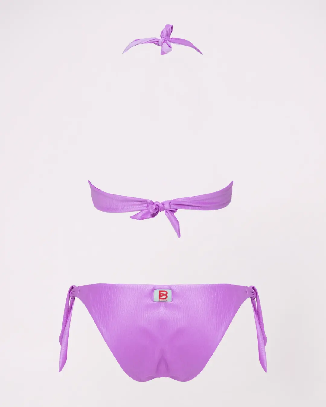 MoD. Vela donna dal design elegante e strutturato, modello a vela ideale per chi cerca sostegno e comfort senza rinunciare allo stile. Realizzato in tessuto di qualità con raffinato effetto coccodrillo, è dotato di ferretti che sostengono e valorizzano il seno. Il dettaglio con anello centrale dona un tocco moderno e femminile, mentre l’allacciatura al collo con fiocco permette una regolazione personalizzata.. Slip brasiliana chiusa, pensato per valorizzare la silhouette a forma di V e slanciare la figura Consigli per vestibilità Abbondante, regolare scegliere la propria taglia. adatto ad un seno prosperoso vestibilità Bottom: regolare- slim, scegliere la propria taglia